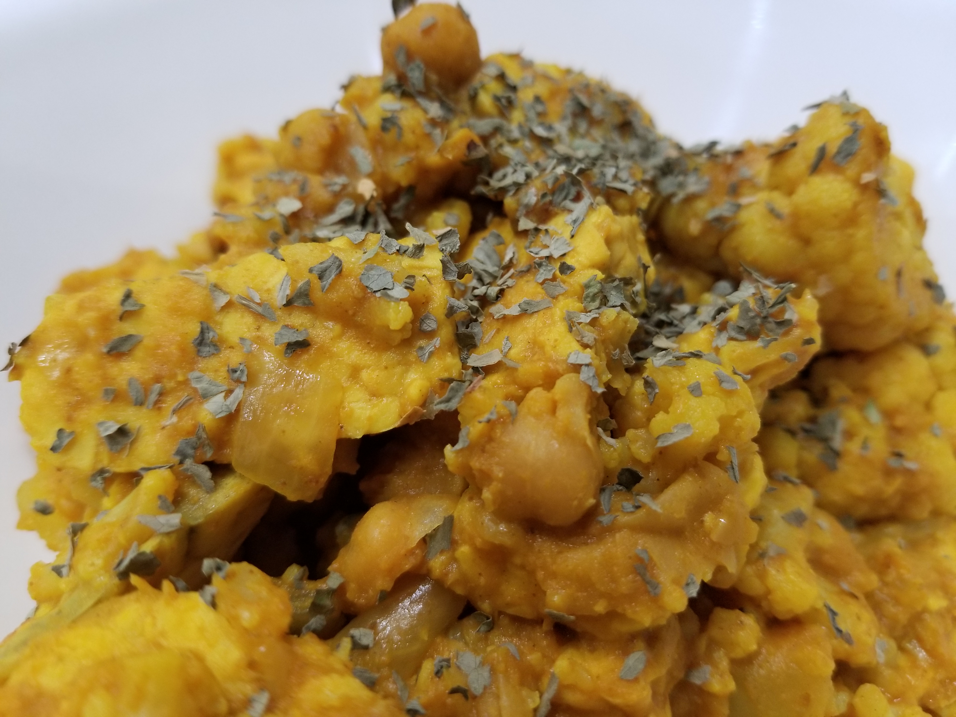 Now that I am done with the Thanksgiving turkey, it’s time to turn back to lighter dishes. I think it is a good thing to have lighter dishes intertwined with the indulgences. This doesn’t mean you have to eat something that isn’t satisfying. I find this time of year a good time to do some great vegetarian dishes. We would call ourselves flexitarians. This means someone who eats both meat and vegetarian dishes. There are plenty of vegetarian dishes that are out of this world. I found this recipe from Abra’s Kitchen for Creamy Pumpkin Cauliflower Curry with Chickpeas and it looked like a good one to adapt that was vegetarian and easy. The last turkey dish was a lot of work, so I am in the mood for simple. This recipe fit the bill. Here are the original stats:
