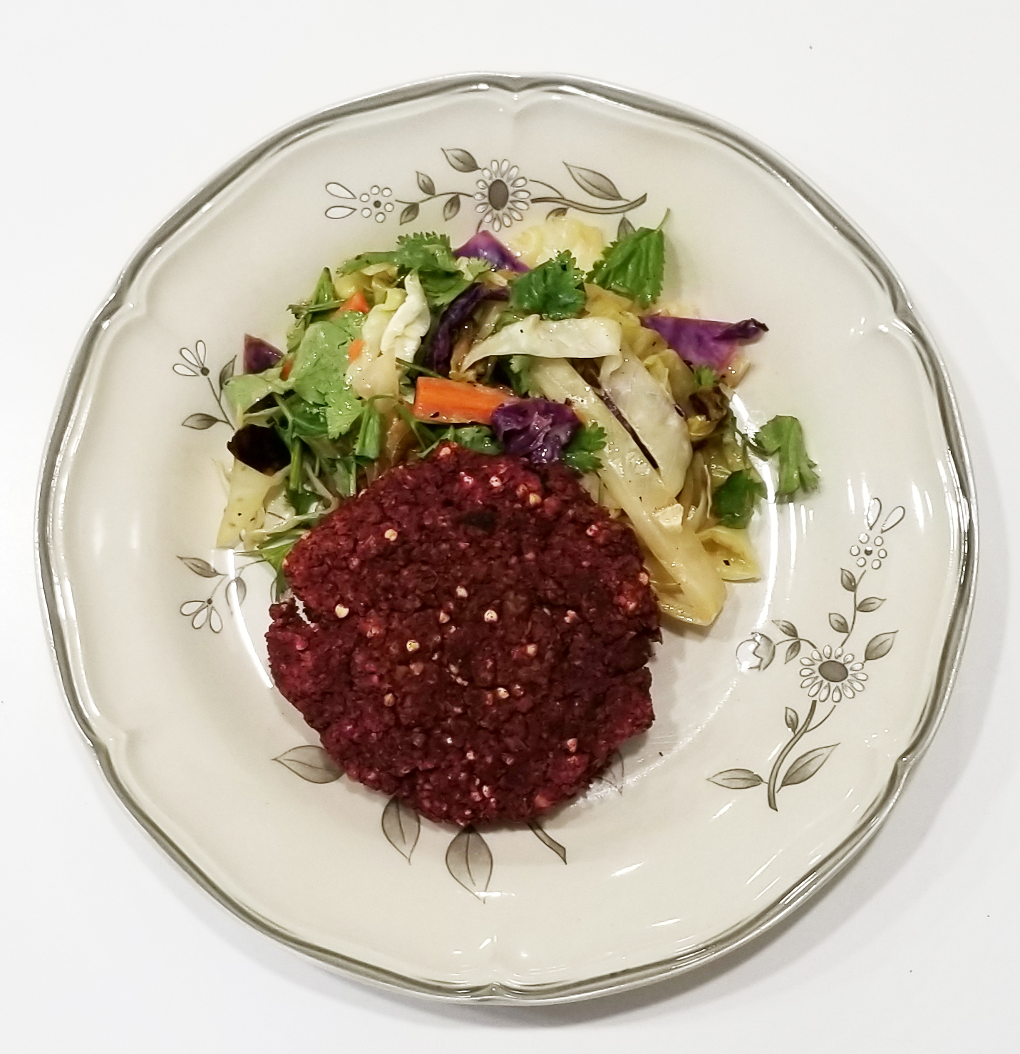 America’s Test Kitchen has done it again with a burger recipe that is a veggie burger that looks like meat. No, it’s not an impossible burger, but a burger made with beets. If your first thought is that beets are yucky, just wait until you try these burgers. I don’t care for beets myself, but I was anxious to try this burger. Their burger was the pinto bean, beet and buckwheat burger. Two things wrong with the ingredients: the pinto beans don’t provide much protein and the bulger cracked wheat. Bulger can be swapped one to one with buckwheat groats. Another trick I learned from America’s Test Kitchen. I am swapping the pinto beans for lentils, which provides the protein. This burger will be the same concept, with slightly different ingredients. I will also be adding a warm coleslaw to this recipe to round out the vitamins.