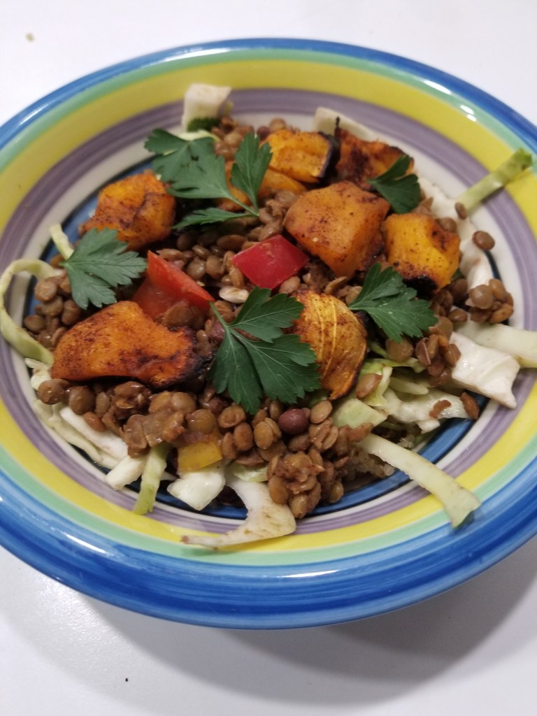 As for the butternut squash tacos, the original recipe came from Cookie and Kate. I love butternut squash and now that we are moving in to fall, hard squashes are coming into season. Frequently when you buy a butternut squash, you get way more than you need for a recipe. What I end up doing is cutting the whole thing up, taking what I need, and freezing the rest. You have some waiting for you when you need it the next time. Butternut squash is a good source of vitamin A, so no worries there. There is a slaw that is included, which will bump up the vitamin C and protein. All in all one of the more well rounded dishes I’ve seen nutrition wise. Here are the original stats