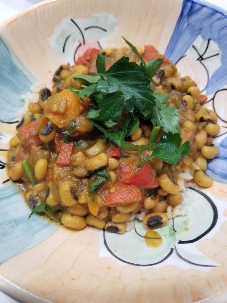 This year I wanted to do another black-eyed pea dish from somewhere in the world. I wanted to choose a dish that you may not have heard of. In this case, I chose a curry because they are easy and delicious. This curry is a black-eyed pea curry called Lobia. I am using a recipe from Veg Recipes of India to start with. This is a flavorful recipe that uses a lot of spices and tomatoes for flavor. It’s missing some vitamin C, A and protein. Those can easily be fixed. Here are the original stats: