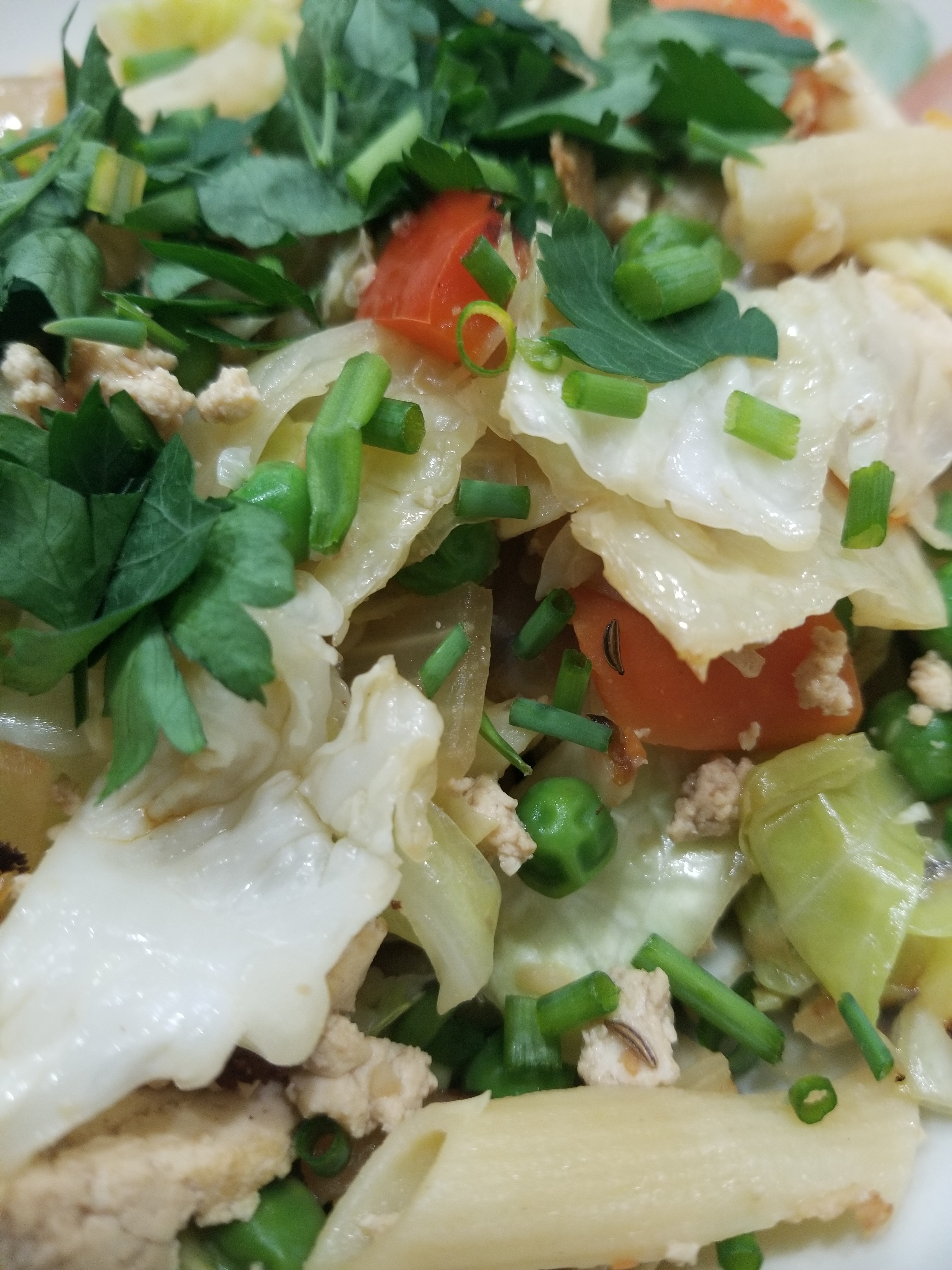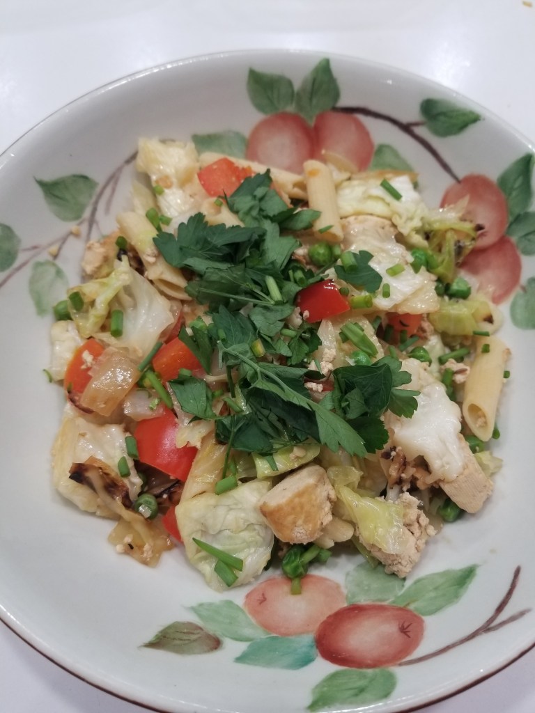 I had never heard of Haluski until this week. I was watching a clip from Diners, Drive-ins and Dives from the Food Channel and came across a simple dish called Haluski. The version of haluski on the show was made from egg noodles, onions, bacon and cabbage. It sounded interesting. So I decided to see how others put a more vegetarian spin on this dish to start and then I wanted to put my own spin on it. What I noticed about this dish is there is a lot of carbs and vitamin C from the cabbage, however, without any protein to balance it out, I could see someone getting full really fast, but hungry not too long after. Even with the cabbage, there is a lack of healthy vegetables too. I grabbed a recipe from Connisserous Veg to get started. Their recipe uses a smoky tofu, but only half a block for 4 servings. Again, no other vegetables besides the cabbage. I think we can add some color, crunch, and more protein. Here are the original stats: