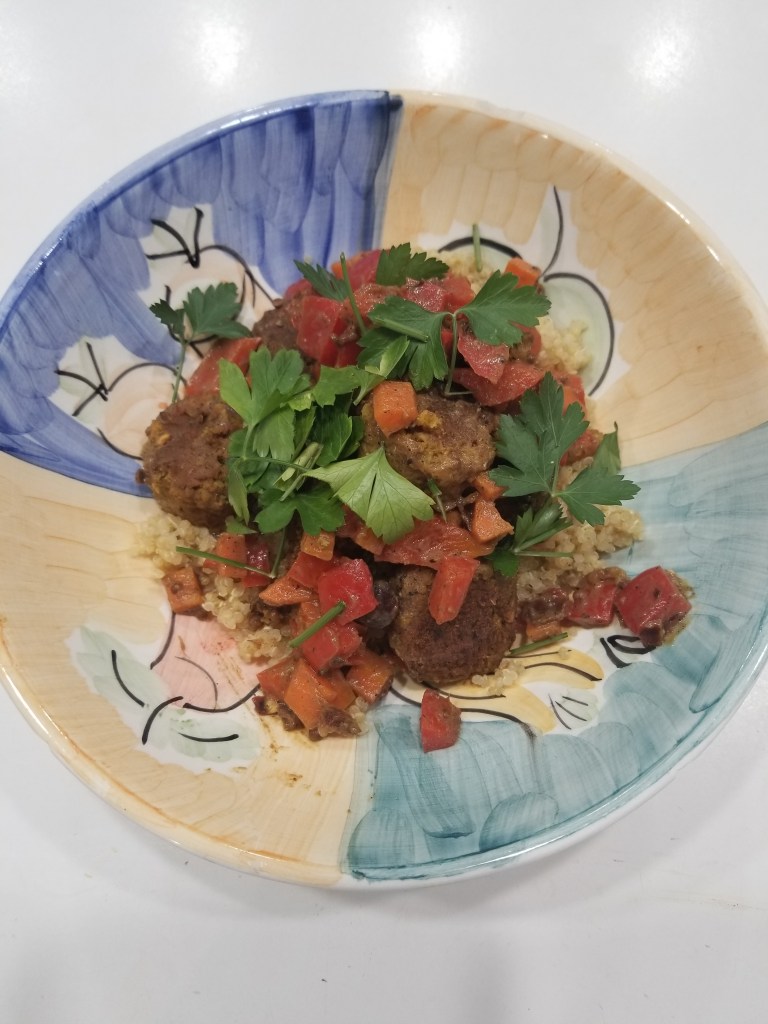 This week I am doing a brand new recipe. One that is based off of Chicken Ghee Roast. It’s basically chicken roasted in a lovely butter based Indian masala. I wanted to make my own version using a lentil roast made into meatballs. Tony has asked me to lay off the tofu this week, so I am taking a recipe for lentil roast and combining it with the method of the Chicken Ghee Roast. This will not be vegan unless you use vegan butter. I am using whole butter instead of ghee, just because it’s easier. There will be a major shift in the method because the chicken requires a marinade where the lentil roast does not. No worries. I think this will be a delicious take. Here are the stats: