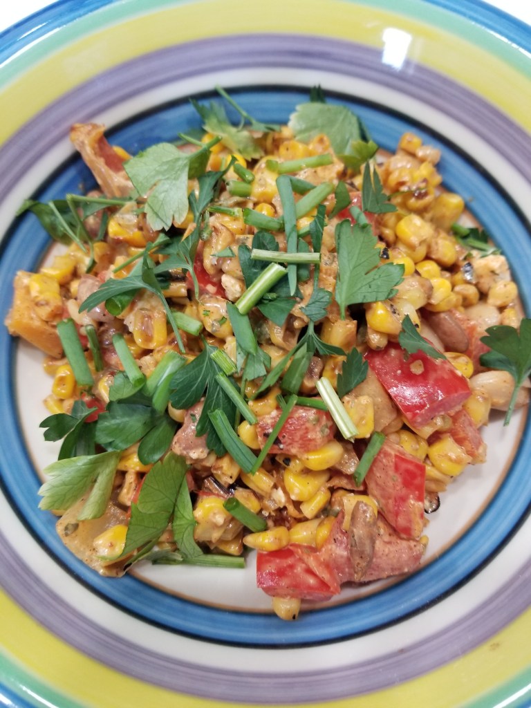 I was watching an America’s Test Kitchen video on the treadmill and saw a recipe for Esquites. It looked so good. For those who are not familiar with Esquites, it is a salad made to be like Mexican street corn. Mexican street corn has crema and cheese and warm spices. Equites take the corn off the cob and makes it into a nice side salad. I didn’t want this to be a mere side salad. I wanted to make this into a meal. I can do this by adding in a bit of protein and a few more veggies to the mix to round out the dish. Since this is a Mexican dish, I’m going to add some beans for protein. I’m also going to make it vegan. You should be able to use frozen corn for this and it will come out great. I would advise against canned corn, just because it would make the dish salty. I started with a recipe from the Edgy Veg and I am going to transform it. Here are the original stats: