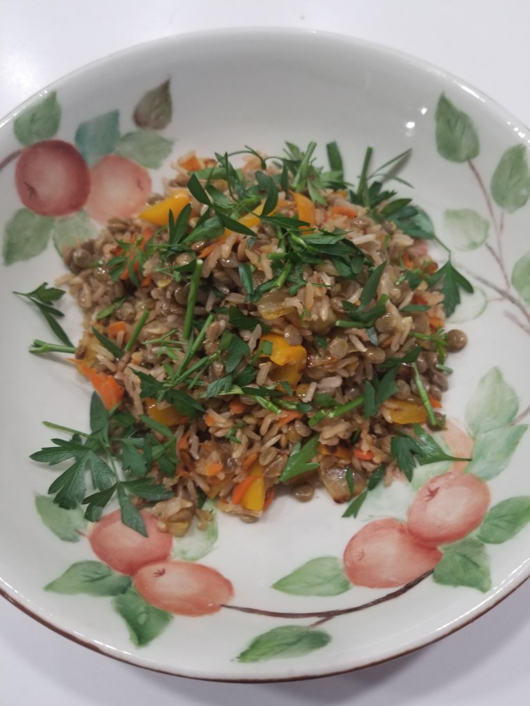 - Heat 1 tablespoon olive oil or vegetable oil in a skillet over medium heat. Stir in the rice for about 1 minute, until the grains turn opaque and white, then stir in the lentils and water. Bring the rice mixture to a boil, then cover and reduce heat to medium-low for 5 minutes. Stir once, then cover and reduce heat further to low. Continue cooking, covered (don’t remove the lid!) until the rice is tender, about 15 minutes more.