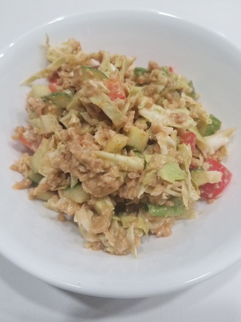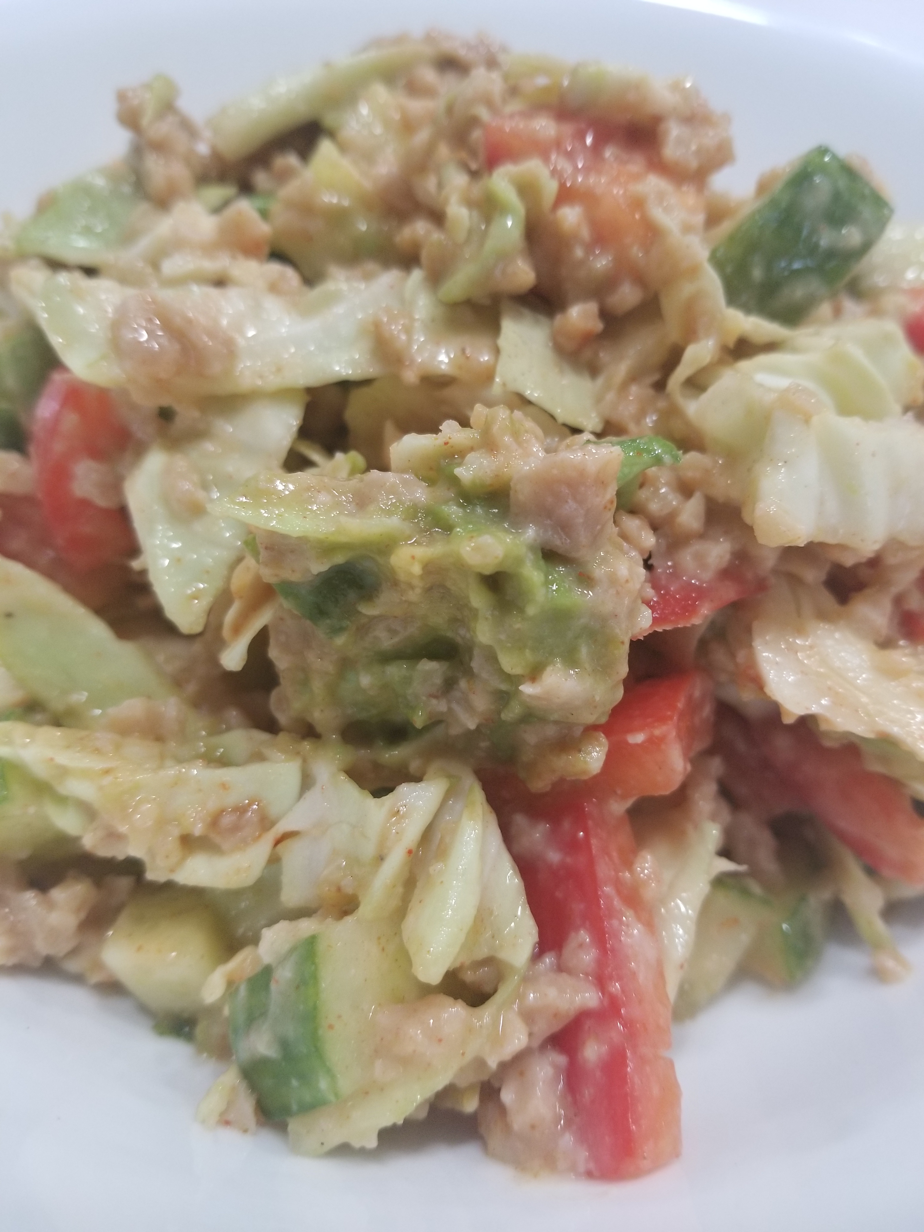 This week has been crazy busy. Not enough time to cook my usual weekly meal. I did realize that I had not shared my new cold lunch. I love having a go to recipe that I can make quickly and ahead of time when I need to take my meal on the go. I don’t eat fast food, because I end of eating more sodium and calories than I want. This meal can be packed in a cooler or stored in a fridge until you are ready to eat it. It’s also great for hot days, when having a hot meal just doesn’t work. This meal is based off of the Shawarma Chickpea Bowls from My Fitness Pal. I found the calories too high and when I made them to fit my calorie profile, they were not filling. So I made some changes that made this more of a coleslaw because you can add cabbage to bulk out a recipe without adding a bunch of calories. I also swapped out the chickpeas for TVP to increase the protein. I’ve been eating this every week and I love it. Here are the stats: