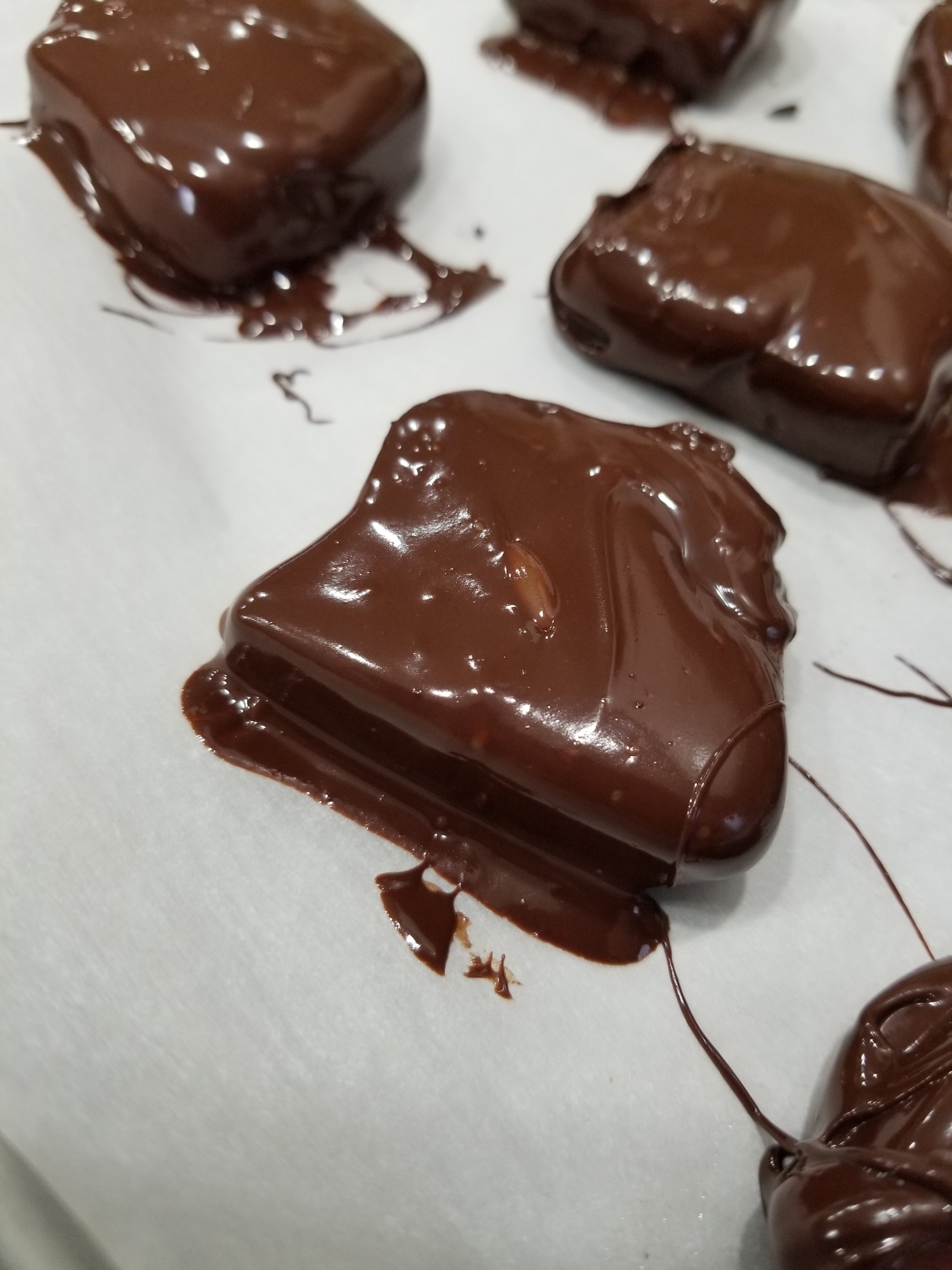 - Set a wire cooling rack over a baking sheet Dip cookies one at a time into the melted chocolate and remove with a fork to the cooling rack. Cool until chocolate is hardened.