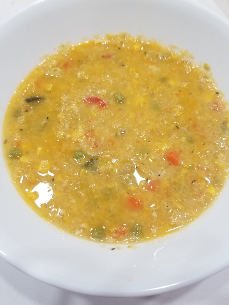 - Add in the zucchini, corn, peas. Simmer the soup until the frozen vegetables are thawed and hot and the zucchini is just cooked.