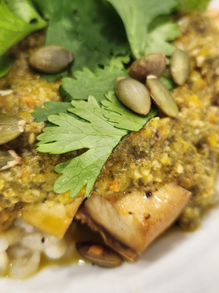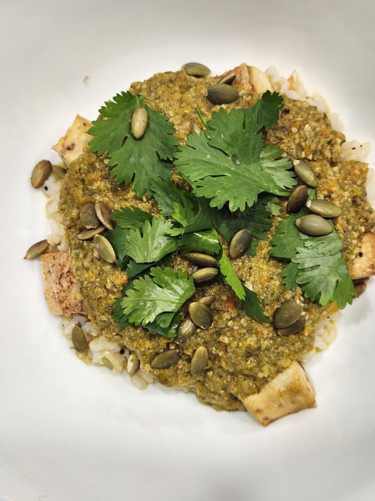 - Once the tofu is done, arrange it on a platter and cover with the Pipian sauce, garnish with pumpkin seeds and fresh cilantro.