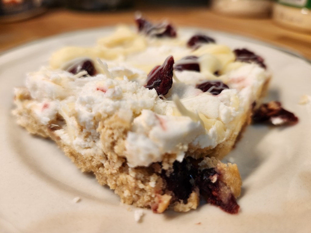 - Spread the frosting on the bars, then sprinkle the dried cranberries on top. Drizzle melted white chocolate over the cranberries.