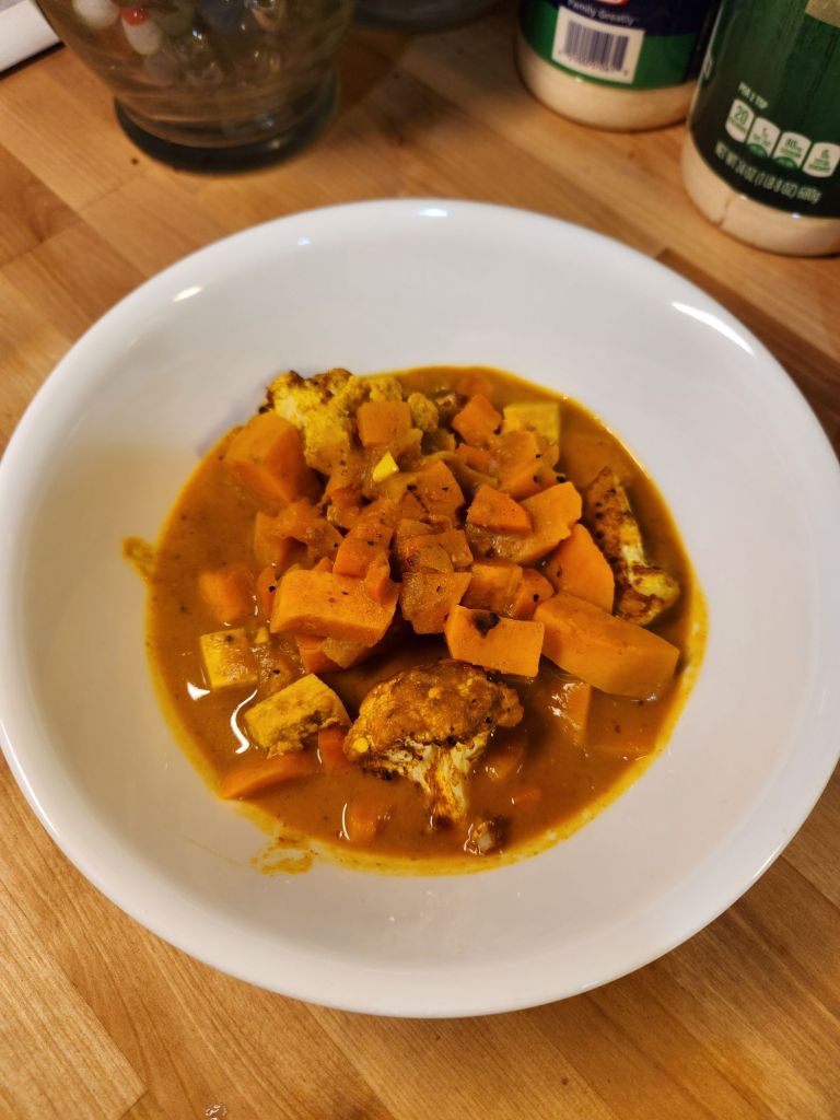 *steps off soapbox*. Now on to the recipe. I am starting with a recipe from Eating Well for Roasted Cauliflower & Potato Curry Soup. This recipe is almost perfect. Low calorie and lots of flavor. I will be making a few swaps to lower the sodium. I also plan to make this will all sweet potato, because white potatoes don’t freeze well. They turn all grainy. Finally, it needs some protein.