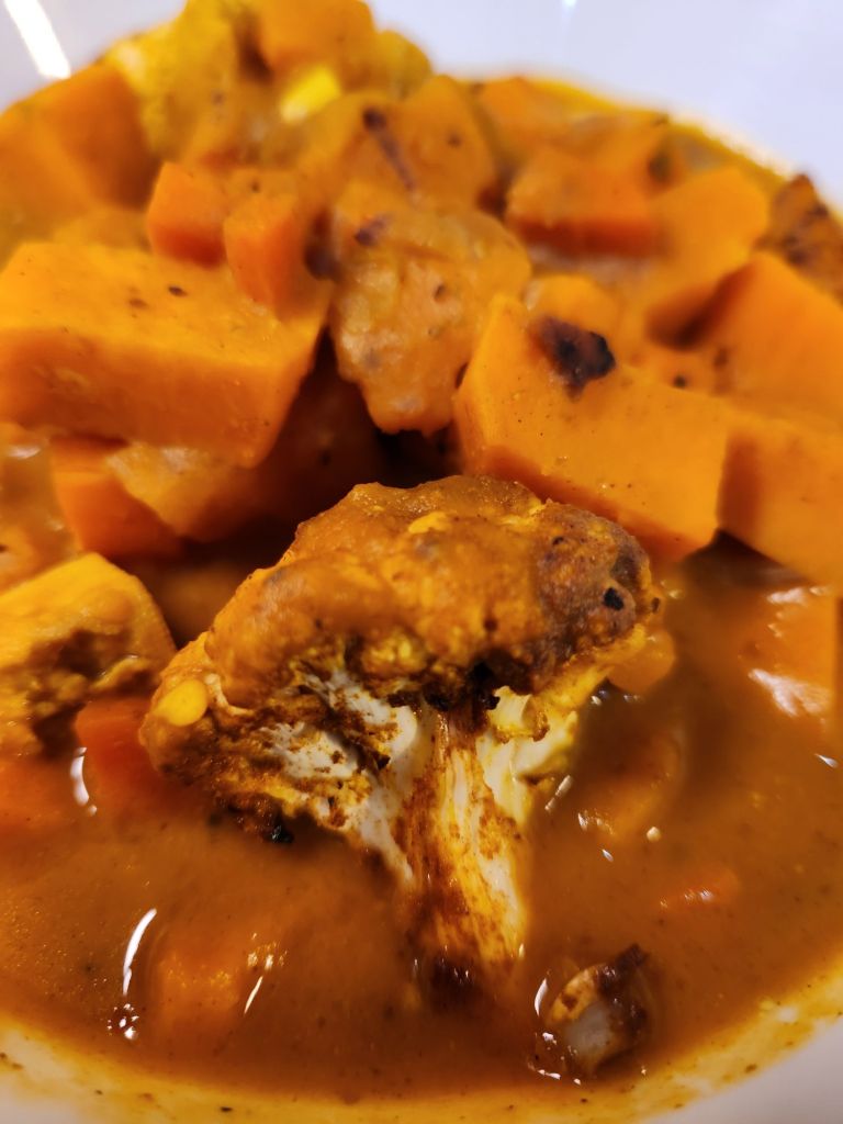 Roasted Cauliflower & Potato Curry Soup with Tempeh