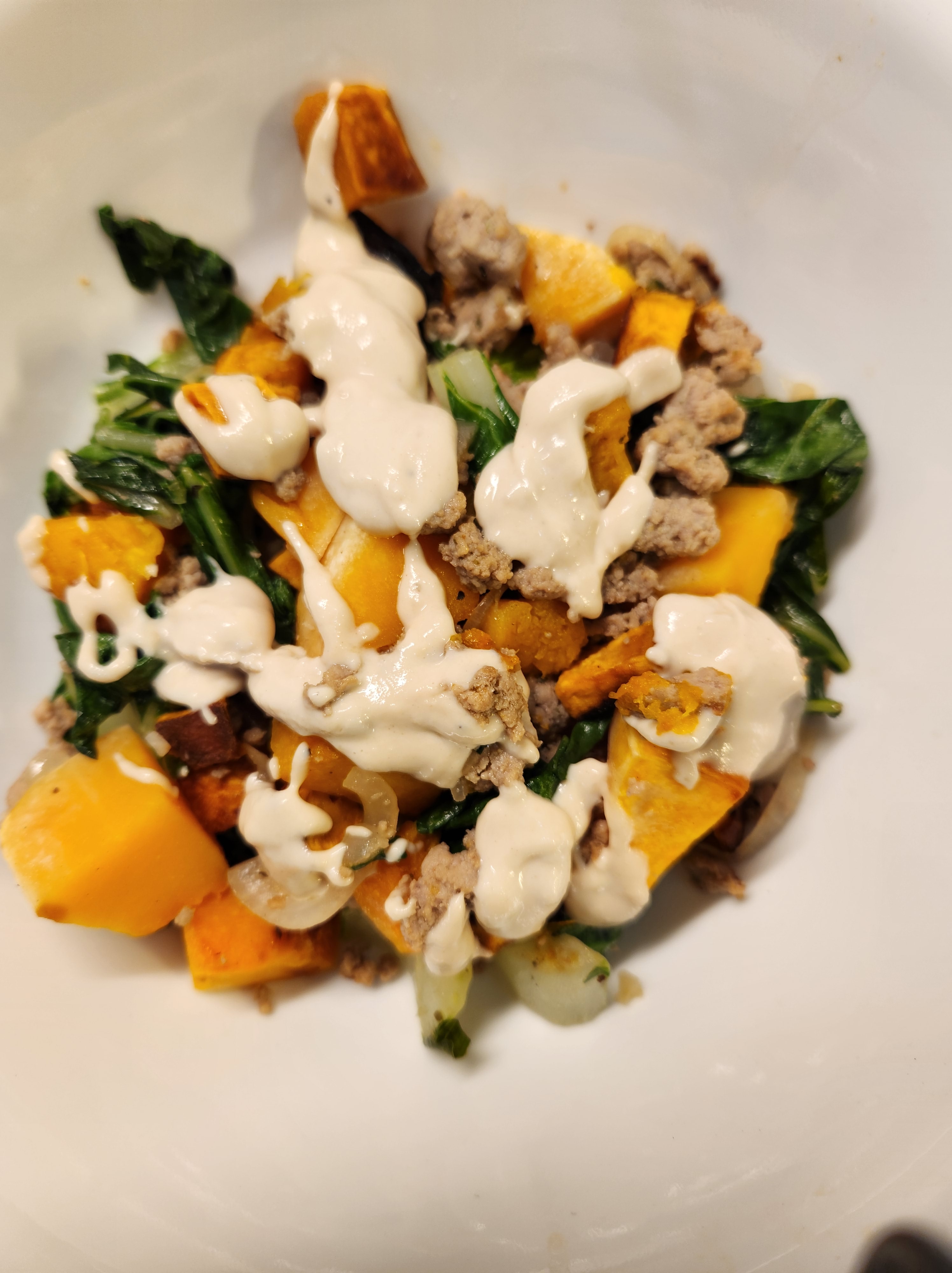 Sausage and Bok Choy Grain Bowl with Creamy Tahini Dressing